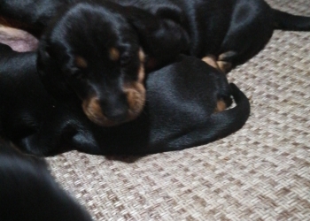 Предлогаю щенков мини таксы. 2 мальчика и 1 девочка.Окрас черно подпалый.Родились 10.08.2021.